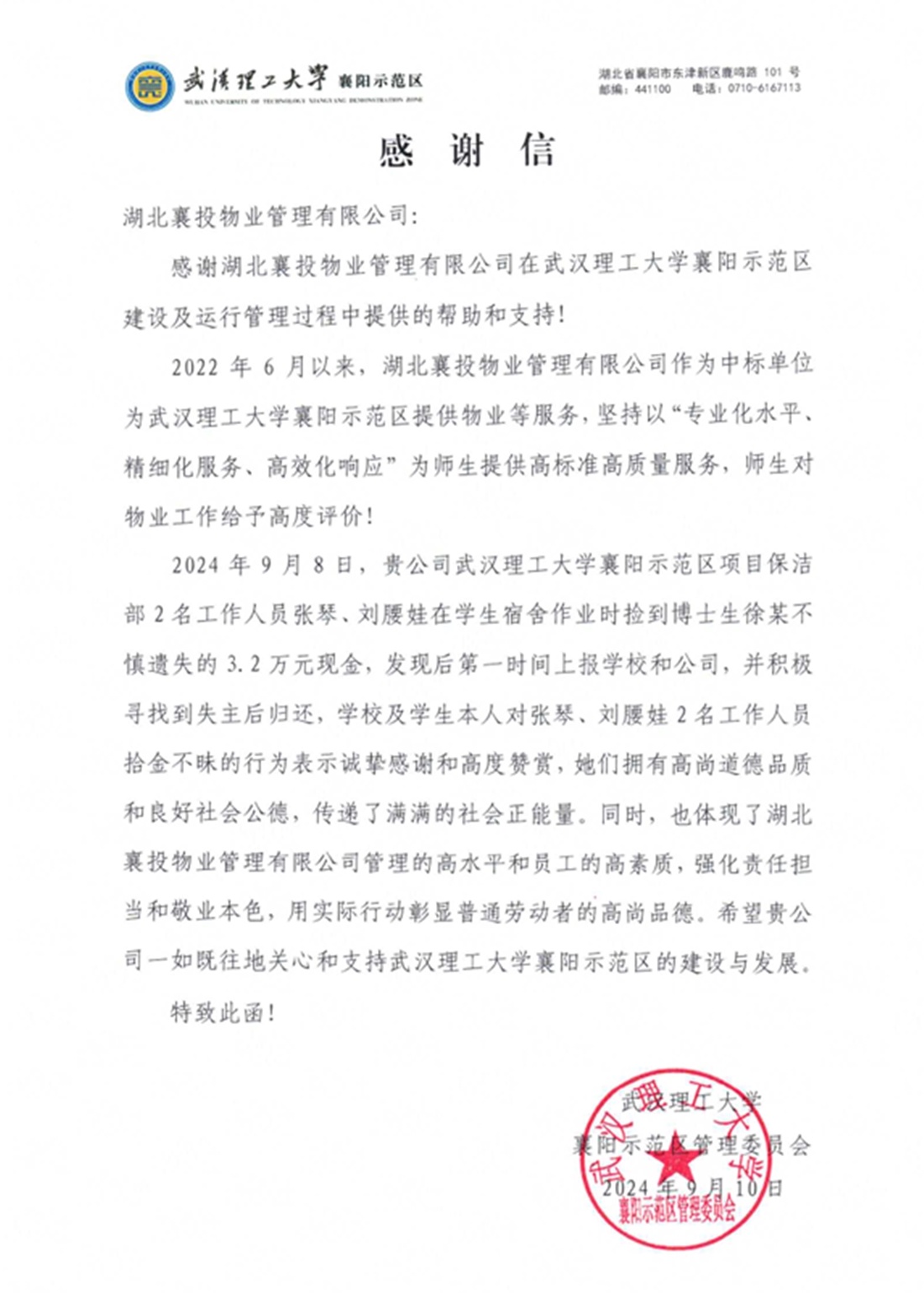 善行(xíng)無界,美(měi)德傳揚——襄投物(wù)業(yè)員(yuán)工(gōng)拾金(jīn)不(bù)昧,3.2萬元完璧歸趙