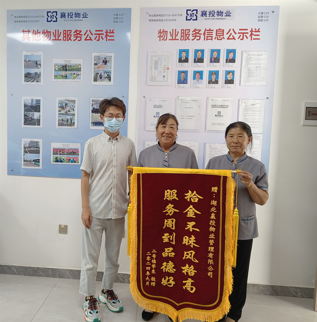 “拾金(jīn)不(bù)昧風(fēng)格高(gāo),服務周到(dào)品德好(hǎo)”這(zhè)面來(lái)自(zì)武漢理(lǐσ)工(gōng)大(dà)學襄陽示範區(qū)的(de)學生(shēng)送上(shàng)的(de)錦旗,表達了(le)對(duì)襄投物(wù)業(αyè)的(de)兩名保潔員(yuán)拾金(jīn)不(bù)昧的(de)感謝(xiè)。